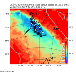 Um 16:34 UTC machte sich HALO dann zu den südlichsten Punkten des Flugpfads auf, wo der Polarwirbel in großer Höhe direkt vermessen werden konnte. Die hohen Ozonwerte (FAIRO) zeigen an, dass sich HALO tief in der Stratosphäre befand.