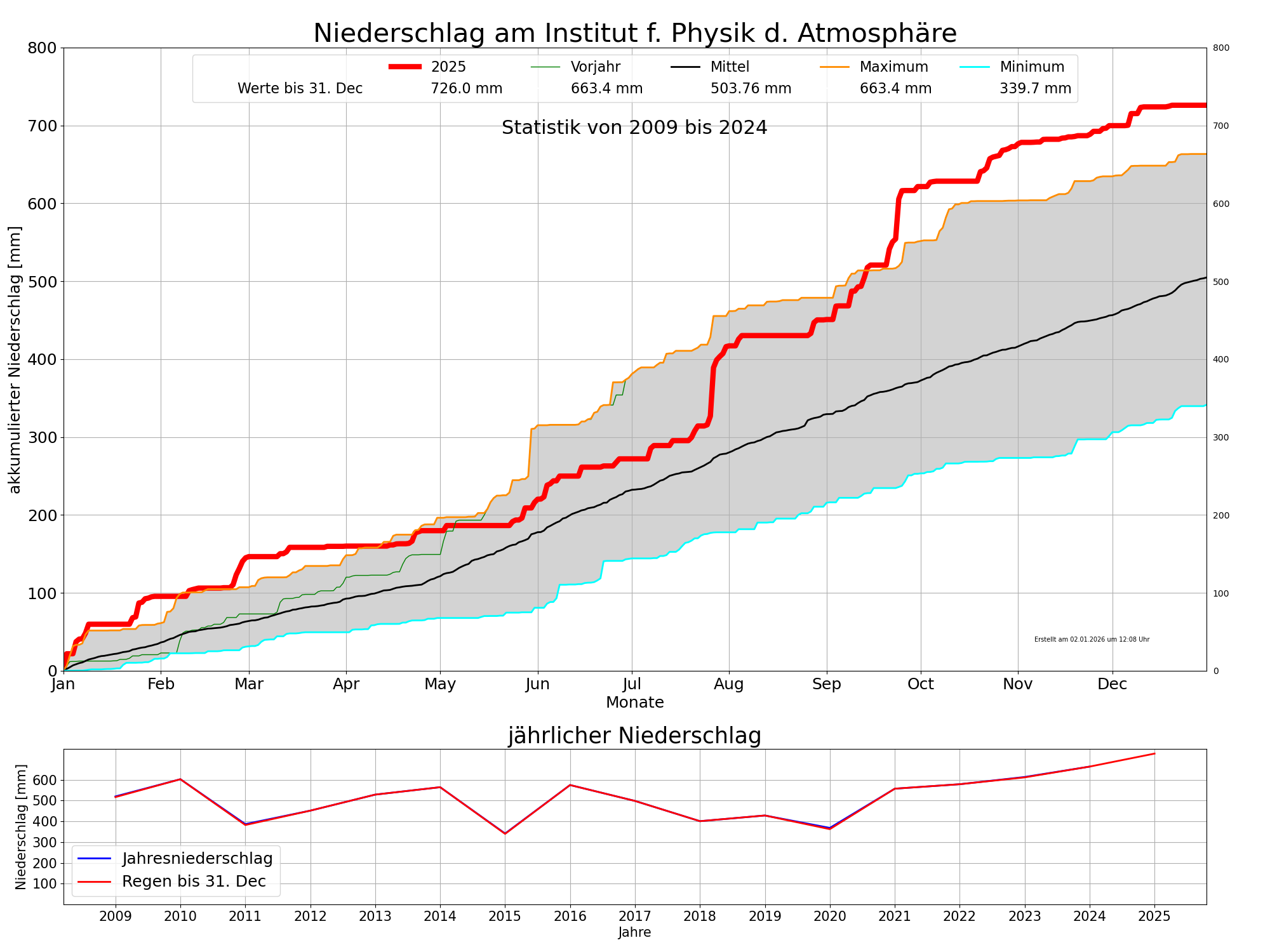 2025 brachte mit Abstand einen neuen Niederschlagsrekord für unsere Messreihe von 2009 bis 2025. Insgesamt 728 mm Niederschlag konnte unsere Station verzeichnen, etwa 60 mm mehr als der Rekord vom Vorjahr. Nach den drei sehr trockenen Jahren 2018 bis 2020 stiegen seither die Jahressummen kontinuierlich an.