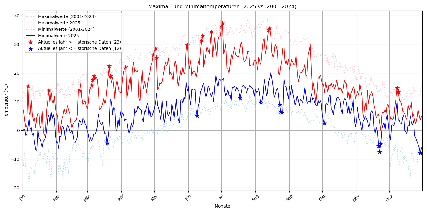 Neben der mittleren Tagestemperatur interessieren uns natürlich auch die Maxima und Minima der einzelnen Tage. Gepunktet zu sehen sind hier die jeweils für diesen Tag bisher gültigen Maximalwerte aus unserer Zeitreihe. Ein Stern deutet an, dass für diesen Tag ein neuer Rekord erreicht wurde. Dabei gab es 23 neue Tageshöchstwerte und 12 neue Tagestiefstwerte. Dies ist bei einem wärmer werdenden Klima so zu erwarten.