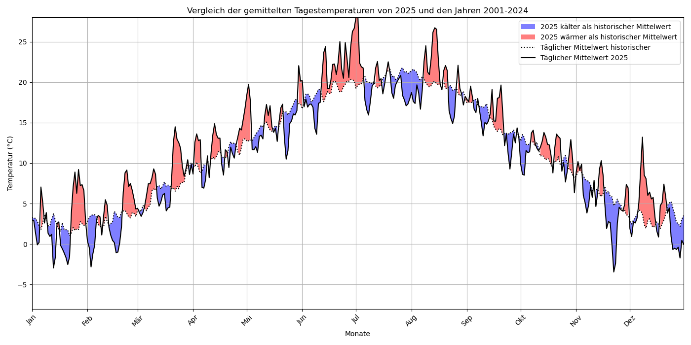 Der Temperaturverlauf der Tagesmitteltemperaturen für das Jahr 2025 ist in folgender Abbildung gezeigt. Zusätzlich wird farblich markiert, wann es im Jahr 2025 wärmer (rot) war im Vergleich zu unserer gesamten Messreihe von 2001-2024. Blaue Flächen zeigen an, wann es im Jahr 2025 kälter war.