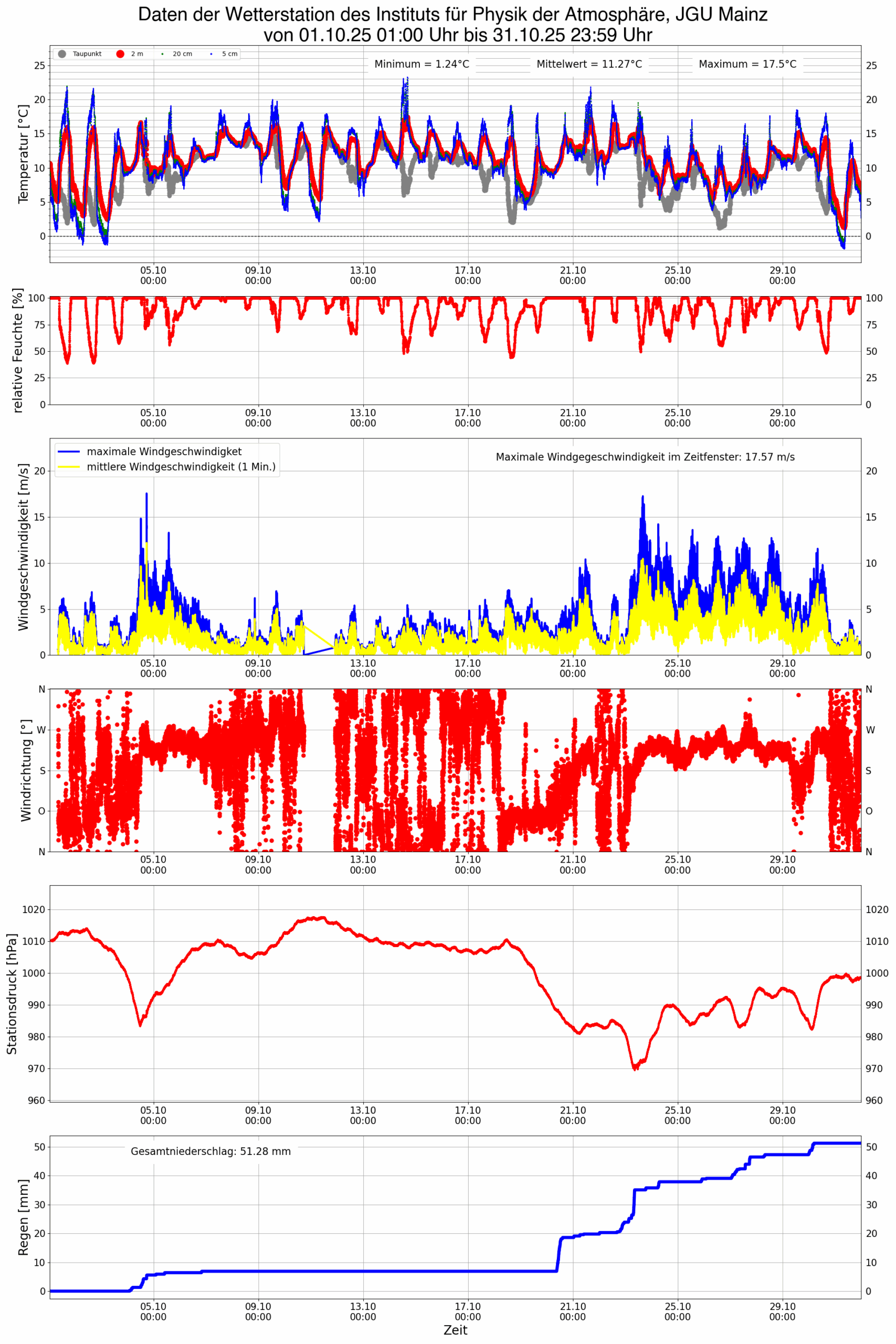 Beim Blick auf die Temperaturkurve macht der Oktober 2025 einen recht unspektakulären Eindruck. Tageshöchsttemperaturen meist bei 15°C, einige wenige klare Nächte mit starker Abkühlung am Monatsanfang und -ende. Ein trockener, ereignisreicher Monat also bis etwa 20. Oktober. Danach wurde der Wind lebhafter, teilweise wurde auch stürmischer Wind verzeichnet und auch Regen war dann wieder ein Thema.